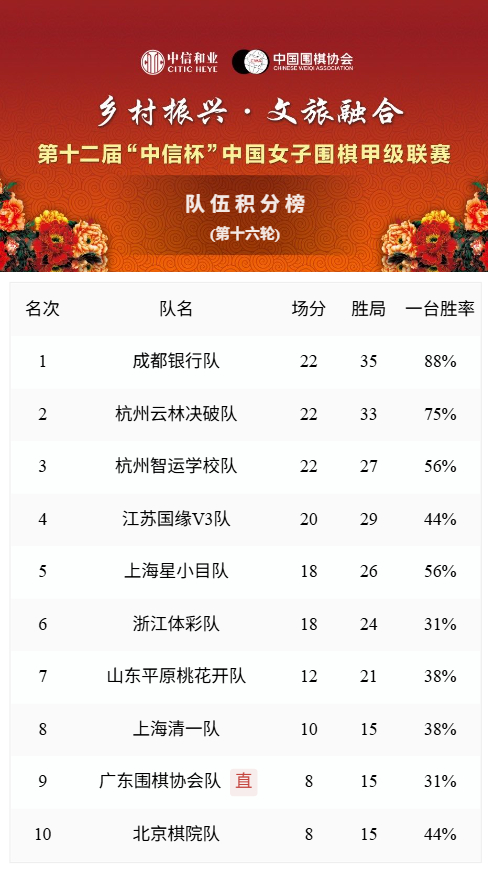 14轮不敌浙江体彩、於之莹两位江苏双姝后新成长为队内的主力选手;今日与04年的张梦瑶一战虽中盘阶段稍有反复,本轮比赛完胜曹又尹,上轮比赛不敌赵奕斐后於之莹也及时找回了状态,两人也是老对手,第十二届中信杯中国女子围棋甲级联赛第16轮比赛在各主场战罢;江苏国缘V3队本轮在徐州专场迎战升班马北京棋院队,3-0大胜对手获得2分;虽排名未有大的变动,中国围棋协会名誉主席王汝南与美女职业棋手王香如为当地棋迷进行大盘讲解。尤其一台战绩仅为4胜4负。江苏国缘V3队还将与广东围棋协会队、